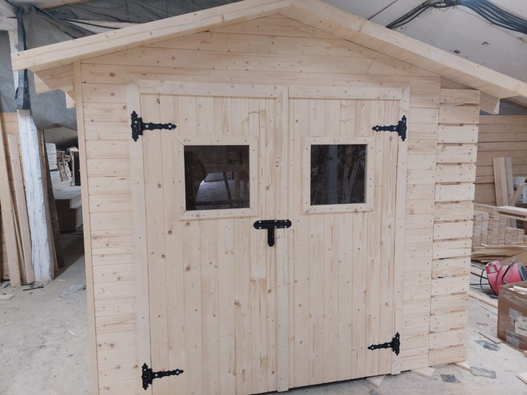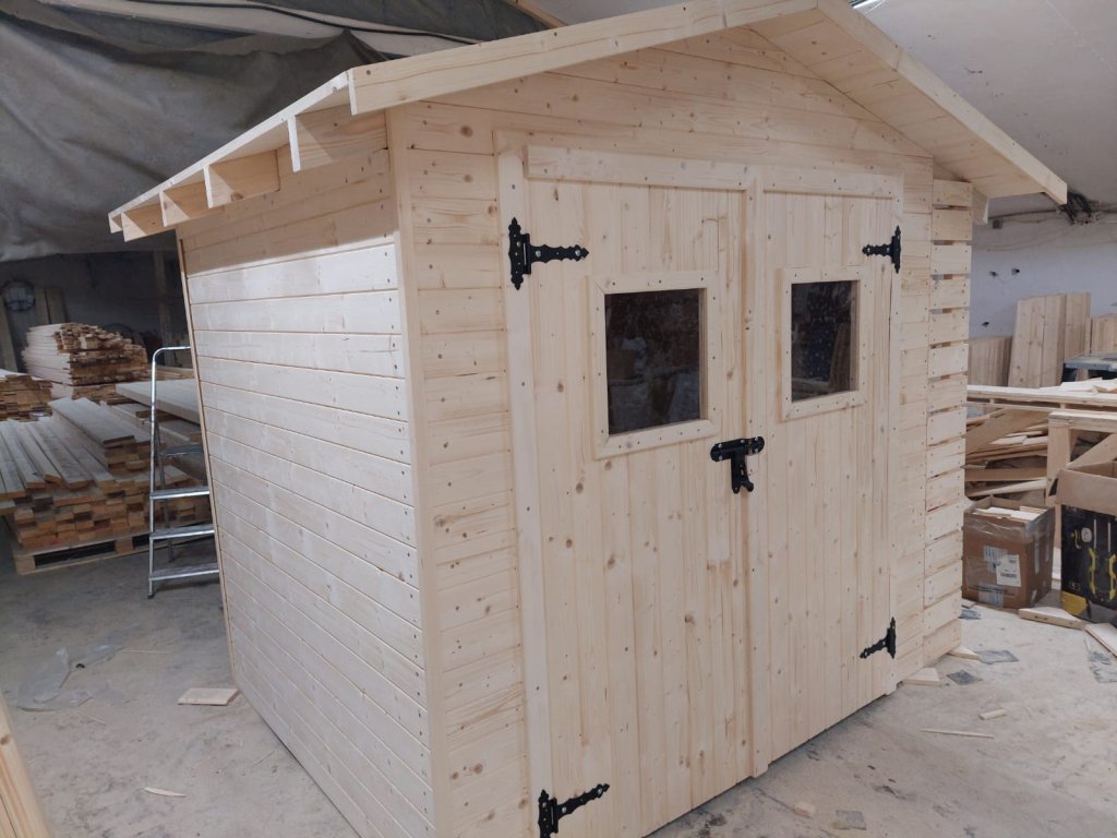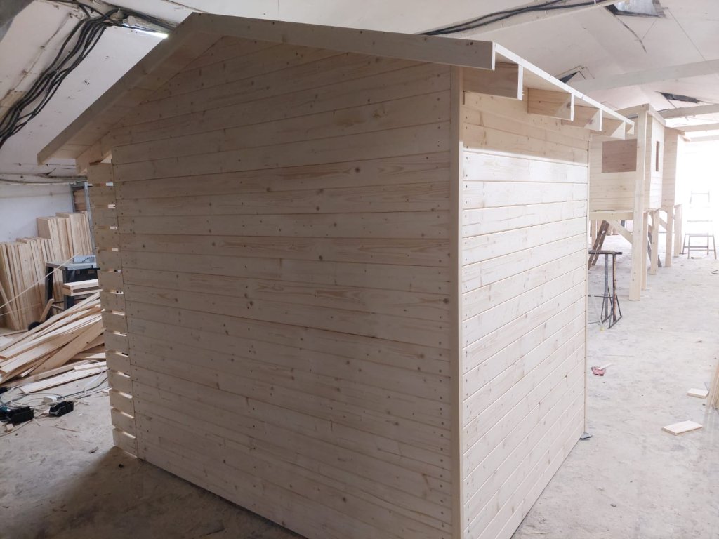 Materiál: sušené nové dřevo (hoblované desky) bez impregnace a laku (připraveno pod impregnaci a lak). Střešní krytina - šindel.